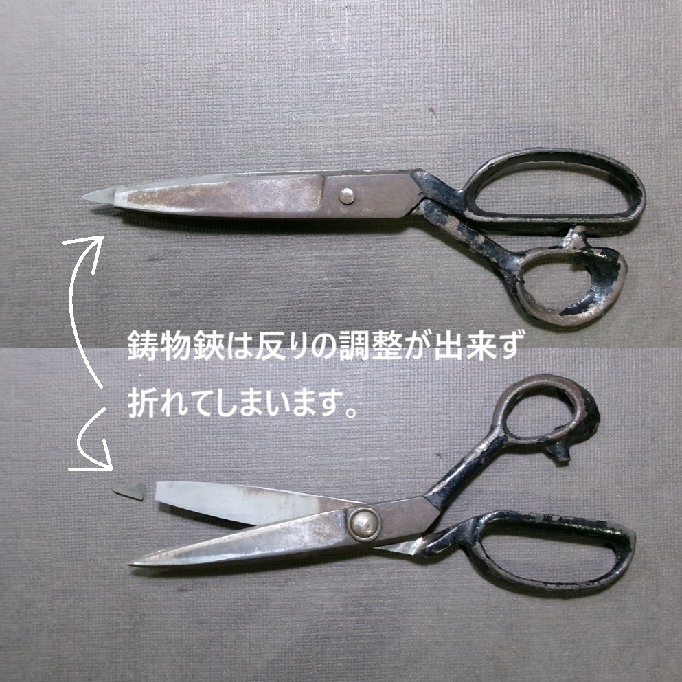 裏のスキ直しと表からの刃線直しが終わってから、鋳物鋏にありがちな不自然にきつい反りを直そうとしたら・・・・折れてしまいました。オール鋳物だったのです。