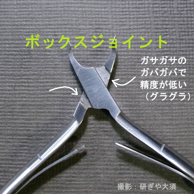 HOME > 研ぎ:グルーミング用品 > 研ぎ:グルーミング用品 ジョイント精度の低いニッパー 2026年2月7日 精度が低い こういうのがやって来るとちょっと憂鬱です。 このようなジョイントの精度が低いキューティクルニッパーは、切る時、すなわち両の刃が合わせる時に、グラついて手加減次第で切れなくなります。 刃が合わないのだから刃先をいくら研いでも関係ありません。 とは言え、いまだにジャンジャンやって来るのだから、テクニックで何とかしてしまえるのでしょうね。 Twitter Share Pocket Hatena LINE コピーする -研ぎ:グルーミング用品