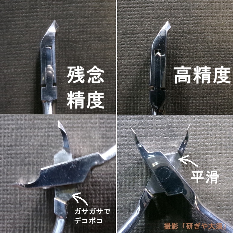 写真左側は精度が低いものです。横から見ると隙間があるのがわかります。開いてみるとグラつきを抑えるべき平がデコボコのガサガサです。閉じた状態で柄の片側をもって振ってみると、ぐらつき音がします。