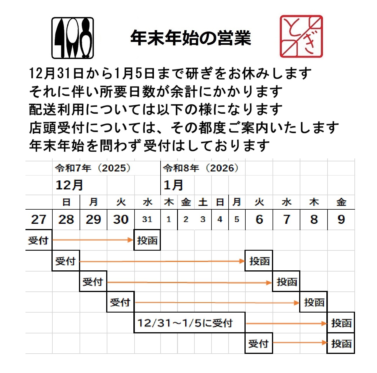 HOME > 未分類 > 未分類 年末年始の営業 2026年1月8日 年末年始の営業 年末年始の営業のお知らせです。 12月31日から1月5日まで研ぎをお休みいたします。 それに伴い所要日数が余計にかかります。 配送利用については図の様になります。 店頭受付については、その都度ご案内いたします。 年末年始を問わず受け付けはしております。 Twitter Share Pocket Hatena LINE コピーする -未分類
