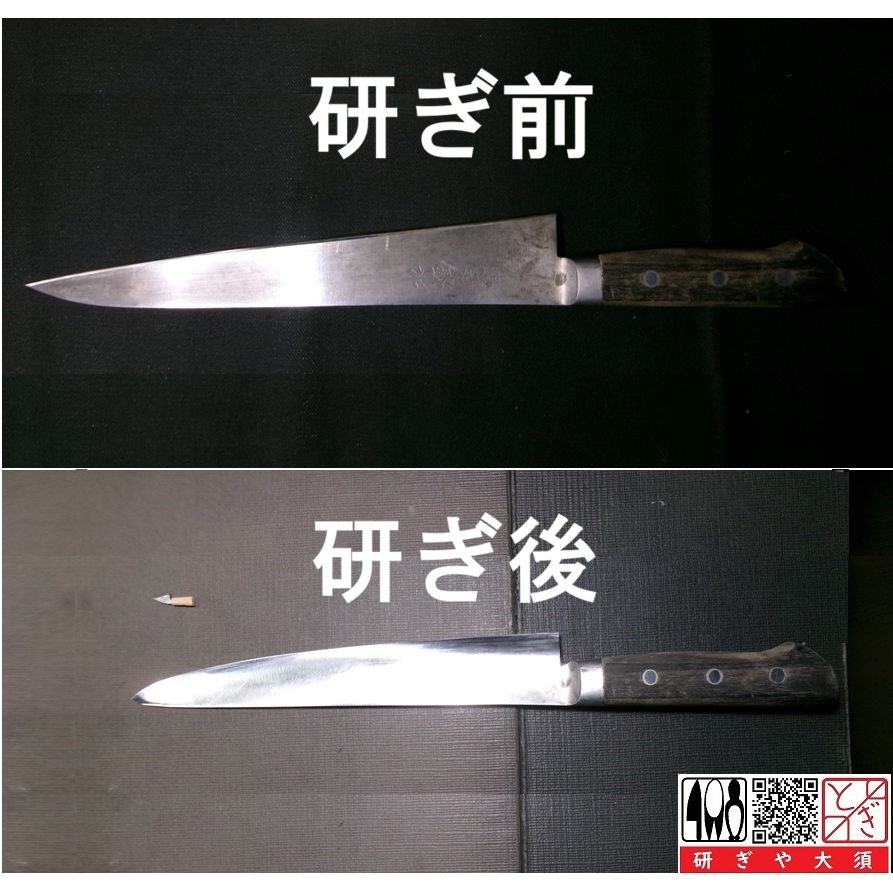 HOME > 研ぎ:包丁 調理用具 > 研ぎ:包丁 調理用具 牛刀の研ぎ:若干短くなる 2026年3月9日 牛刀 このように刃線が歪に直線的になっている場合は、刃渡りがずいぶん縮みます。 研ぎ料金は、2,300円。 Twitter Share Pocket Hatena LINE コピーする -研ぎ:包丁 調理用具