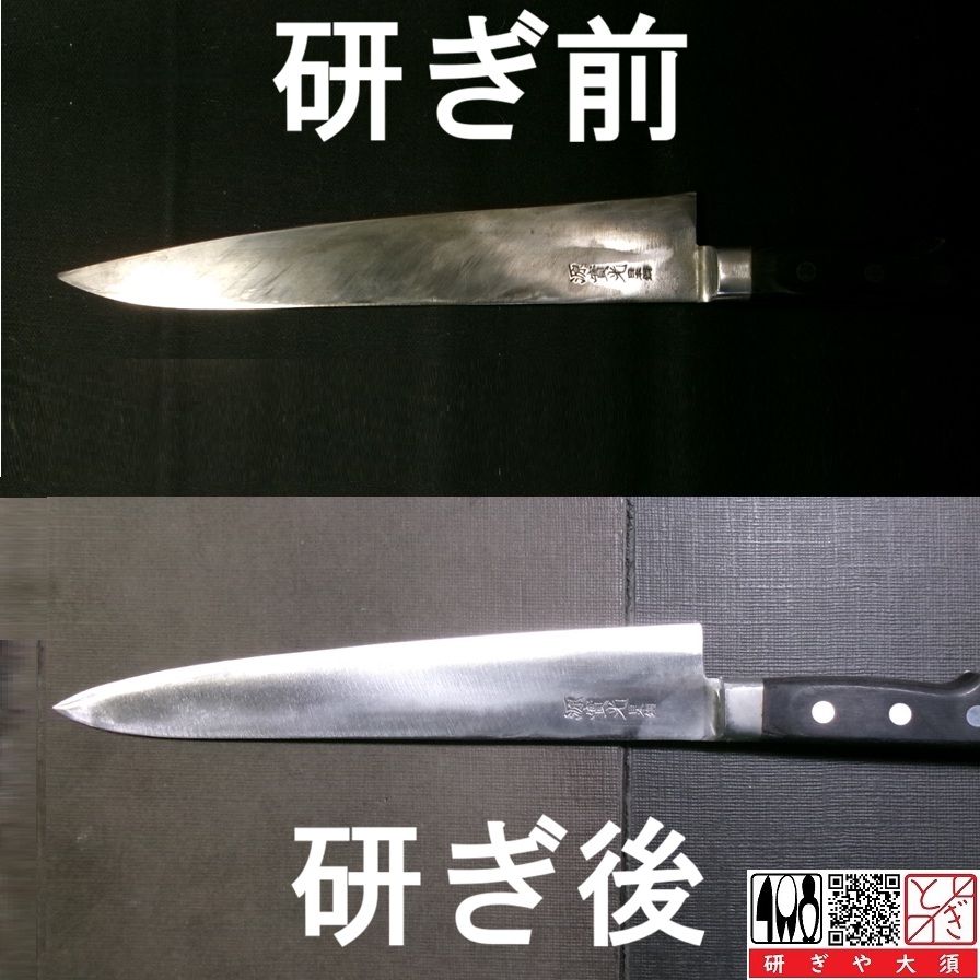 HOME > 研ぎ:包丁 調理用具 > 研ぎ:包丁 調理用具 筋引き牛刀 2026年2月16日 筋引き牛刀 肉を取り扱うお店からやって来ました。 痩せていて、牛刀なのか筋引きなのかわからなくなっていますが、片刃になっているのを大事に使っているので、筋引きとして使っているのでしょう。 研ぎ料金は、2,900円(3.5等級)。 Twitter Share Pocket Hatena LINE コピーする -研ぎ:包丁 調理用具