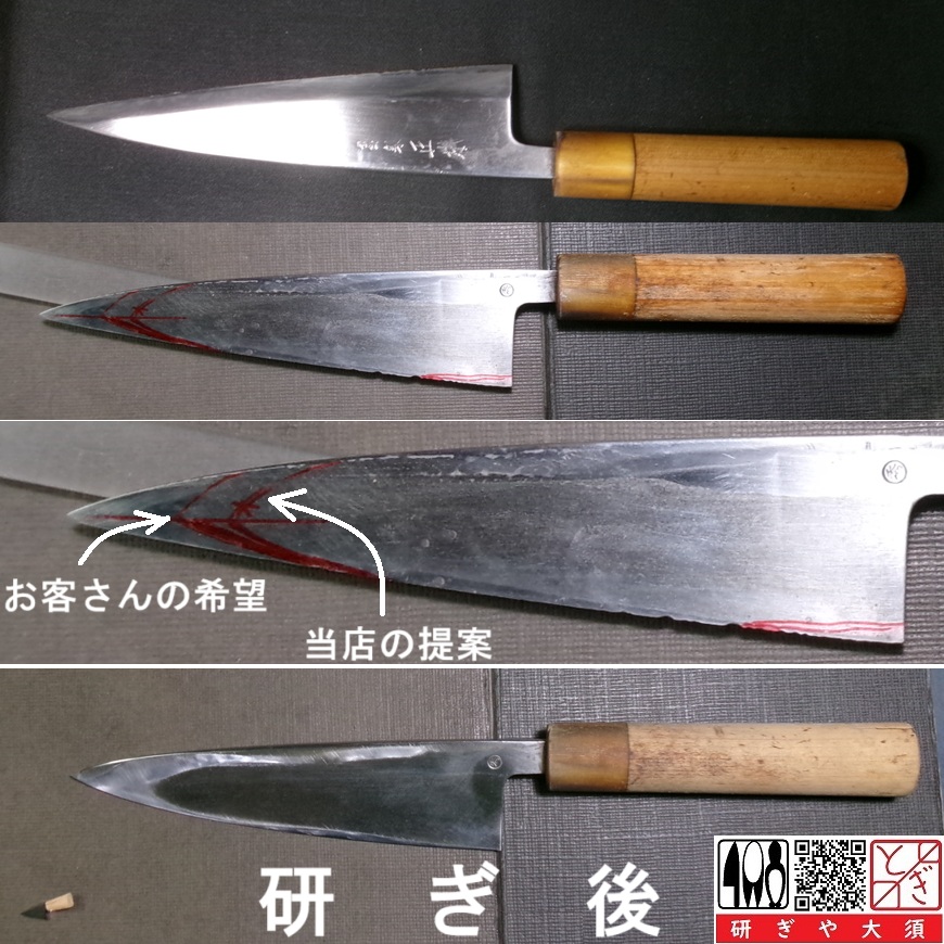 HOME > 研ぎ:包丁 調理用具 > 研ぎ:包丁 調理用具 頑張ったのはエライ:出刃包丁 2025年8月25日 出刃包丁 研ぎ減って刃線が直線的になってる出刃包丁が来ました。 切っ先一寸あたりにあるはずのムクリのピークがおとなしくなりすぎているます。 私「こんな感じに刃渡りが縮みますよ」 お客さん「直線的なのが好みなので、もう少し長めに」 という、やり取りがありました。 研ぎ料金は、3,200円。 Twitter Share Pocket Hatena LINE コピーする -研ぎ:包丁 調理用具